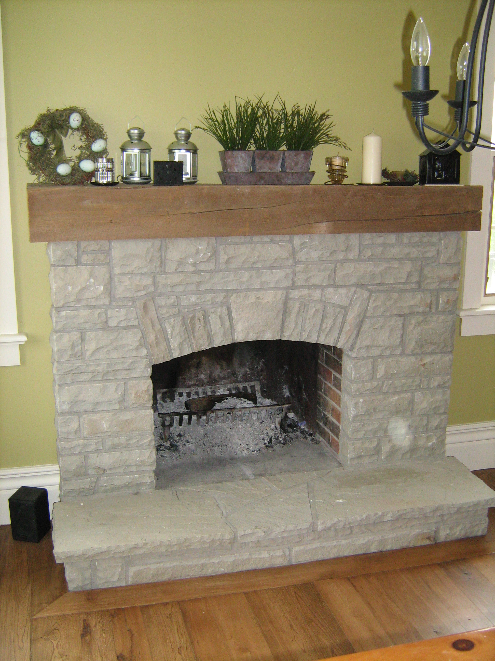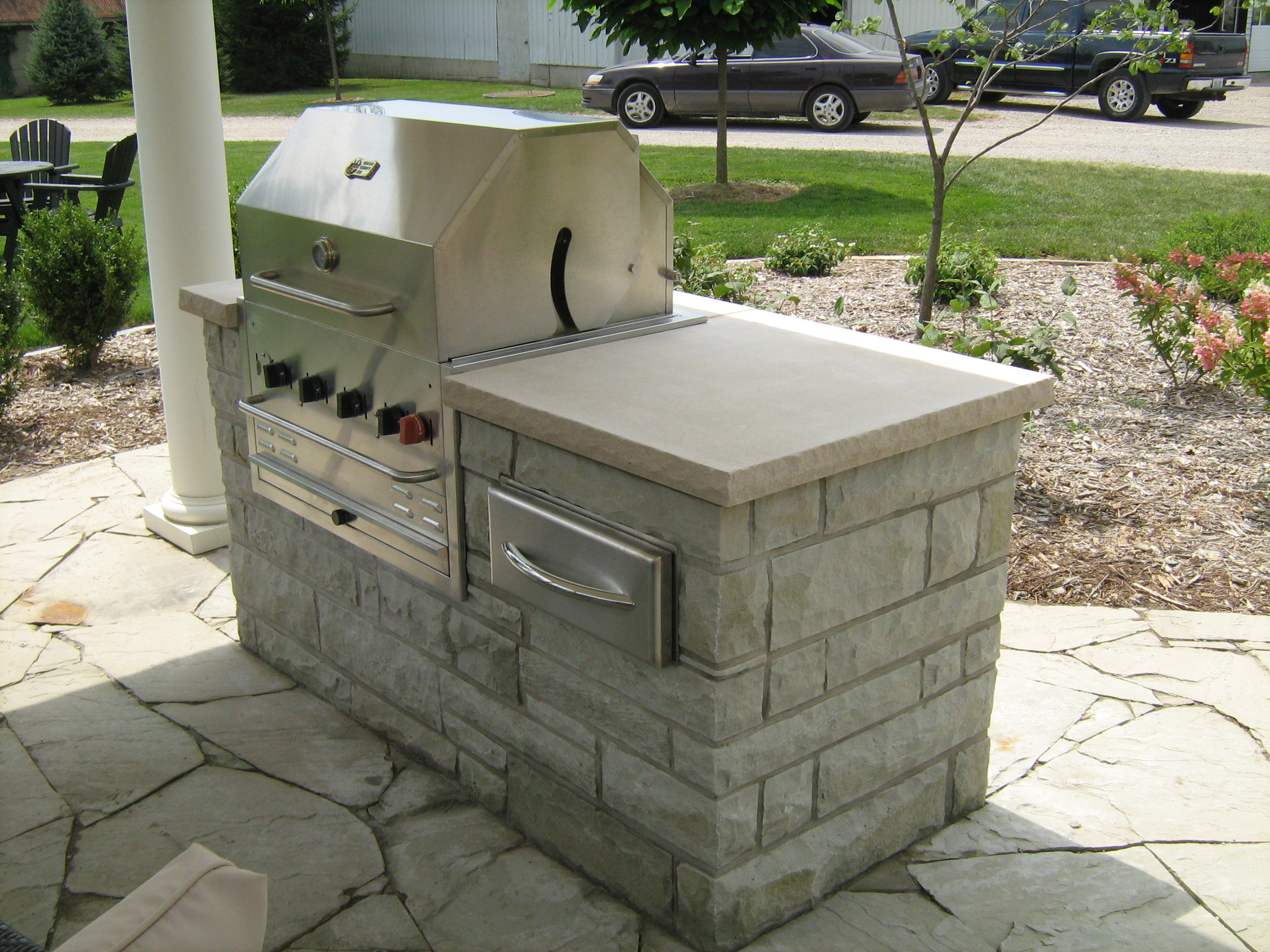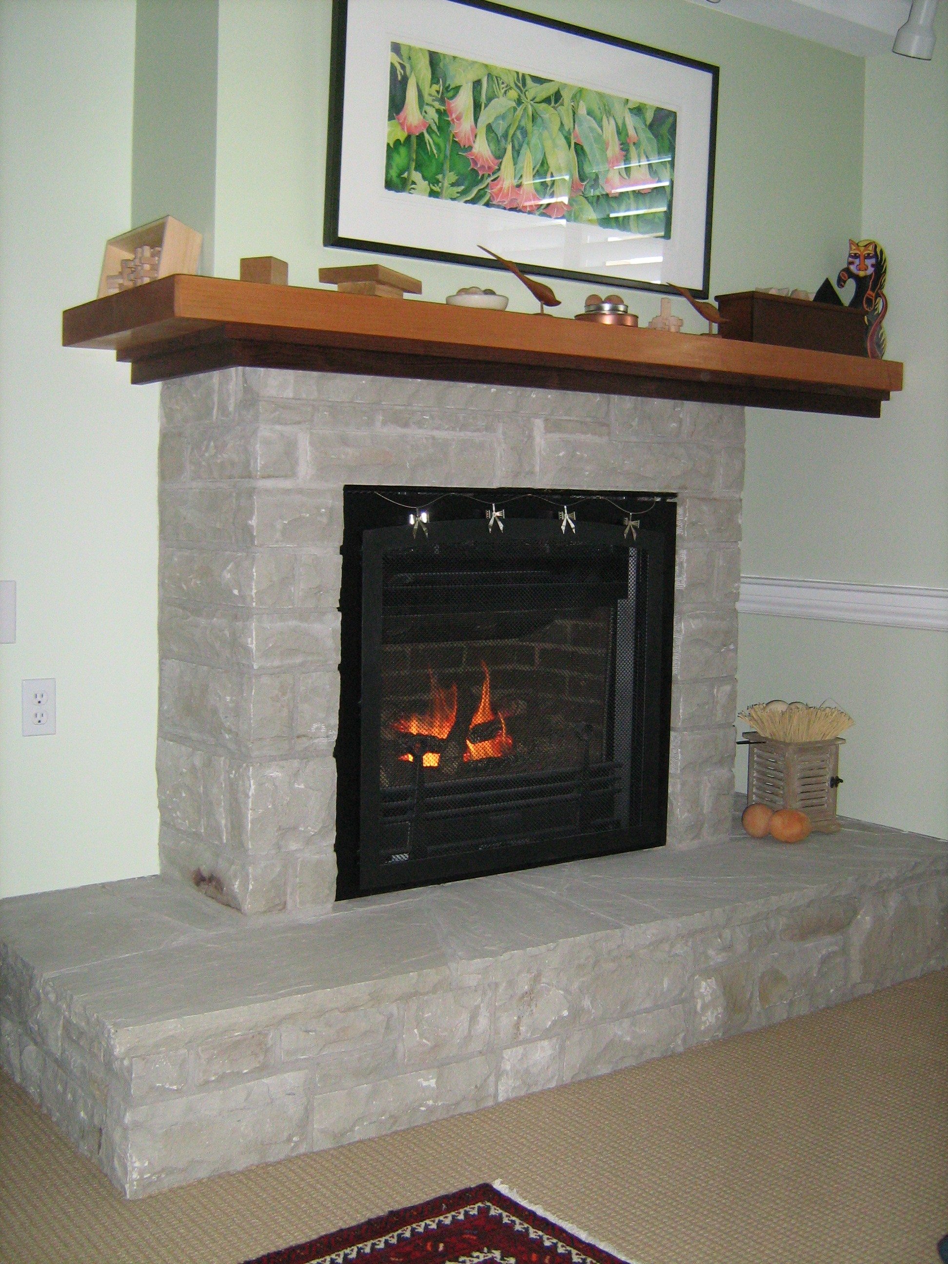Flagstone hearth and natural stone veneer wallCredit Valley sandstone barbecue with Indiana limestone countertopFieldstone wall with Credit Valley flagstone hearthCredit Valley stone, fireplace and hearth